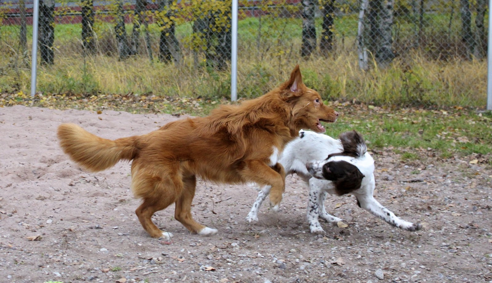Tällä viikolla uusien kavereiden tapaaminen sen kun jatkui. Kävimme eilen kotikaupungin toisessa koirapuistossa tapaamassa samaisen facebookin pentu- ja koiratreffi -ryhmän kautta löytyneitä sekarotuista aikuista narttukoira Wilmaa ja sen omistajaa. Tällä kertaa otin itse kameran mukaan, jotta sain kivoja kuvia leikeistä. Koirapuistossa oli valmiiksi monta muutakin koiraa ja aluksi Lola ei meinannut uskaltaa mennä portista sisään, koska kaverit tulivat vastaan ja Lolaa hiukan jännitti. Hetken se taas turvautui minuun ja pysytteli lähellä, mutta tällä kertaa Lola rohkaistui aika nopeasti ja lähti leikkiin muiden kanssa. Leikit sujuivat aika monenkin erilaisen koirakaverin kanssa. Lopuksi kun muut lähtivät, Lola ja Wilma pääsivät tutustumaan kahdestaan toisiinsa paremmin. Wilma on jo 3-vuotias, joten se ei ollut ainakaan aluksi kovinkaan innostunut Lolan leikkiyrityksistä. Kyllä ne kuitenkin intoutuivat yhdessä juoksemaan ja riehumaankin. Sen jälkeen Lola alkoi seuraamaan Wilmaa ja kun toinen koira tuli viereiseen koira-aitaukseen ja Lolaa jännitti, se hakikin turvaa ja tukea Wilmasta eikä minusta. Se oli todella hellyyttävää nähdä. :) Tapaamme varmasti myös Wilman ja sen omistajan uudelleen, jotta koirat pääsevät tutustumaan vieläkin paremmin. Tässä kuvia eilisestä leikkihetkestä: